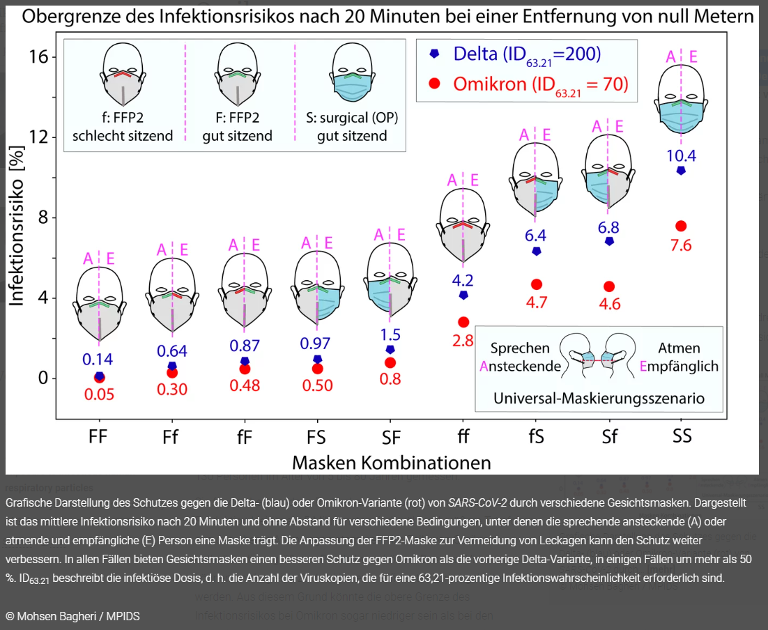 Sie fanden heraus, dass Partikel aus der Lunge zum Zeitpunkt der Produktion kleiner als 5 Mikrometer sind, während größere Tröpfchen aus den oberen Atemwegen stammen. Im Falle von Omikron enthalten diese größeren Partikel eine höhere Dosis an Virionen und können im Vergleich zu den kleineren effizienter zurückgehalten werden. Aus diesem Grund könnte die obere Grenze des Infektionsrisikos bei Omikron sogar niedriger sein als bei den vorherigen Varianten, vorausgesetzt alle Personen tragen einen Mund-Nasenschutz. Ohne diesen Schutz durch Masken überwiegt die höhere Infektiosität von Omikron.